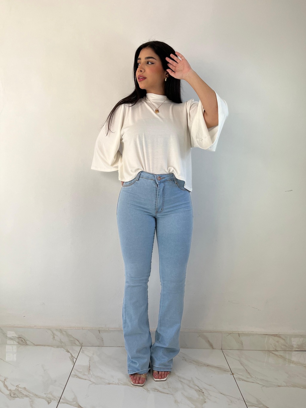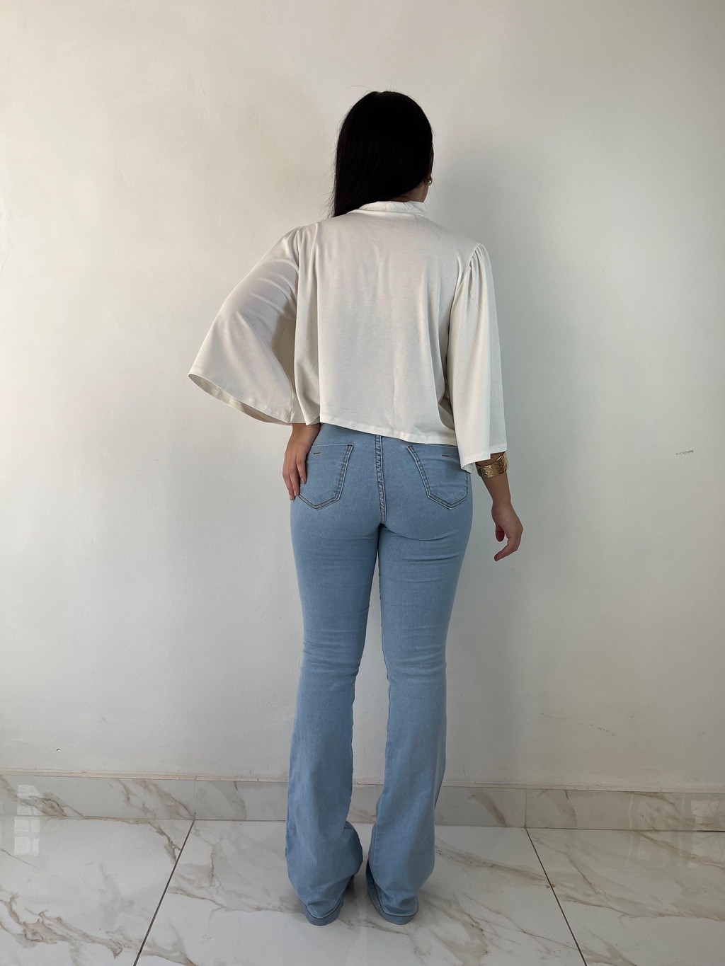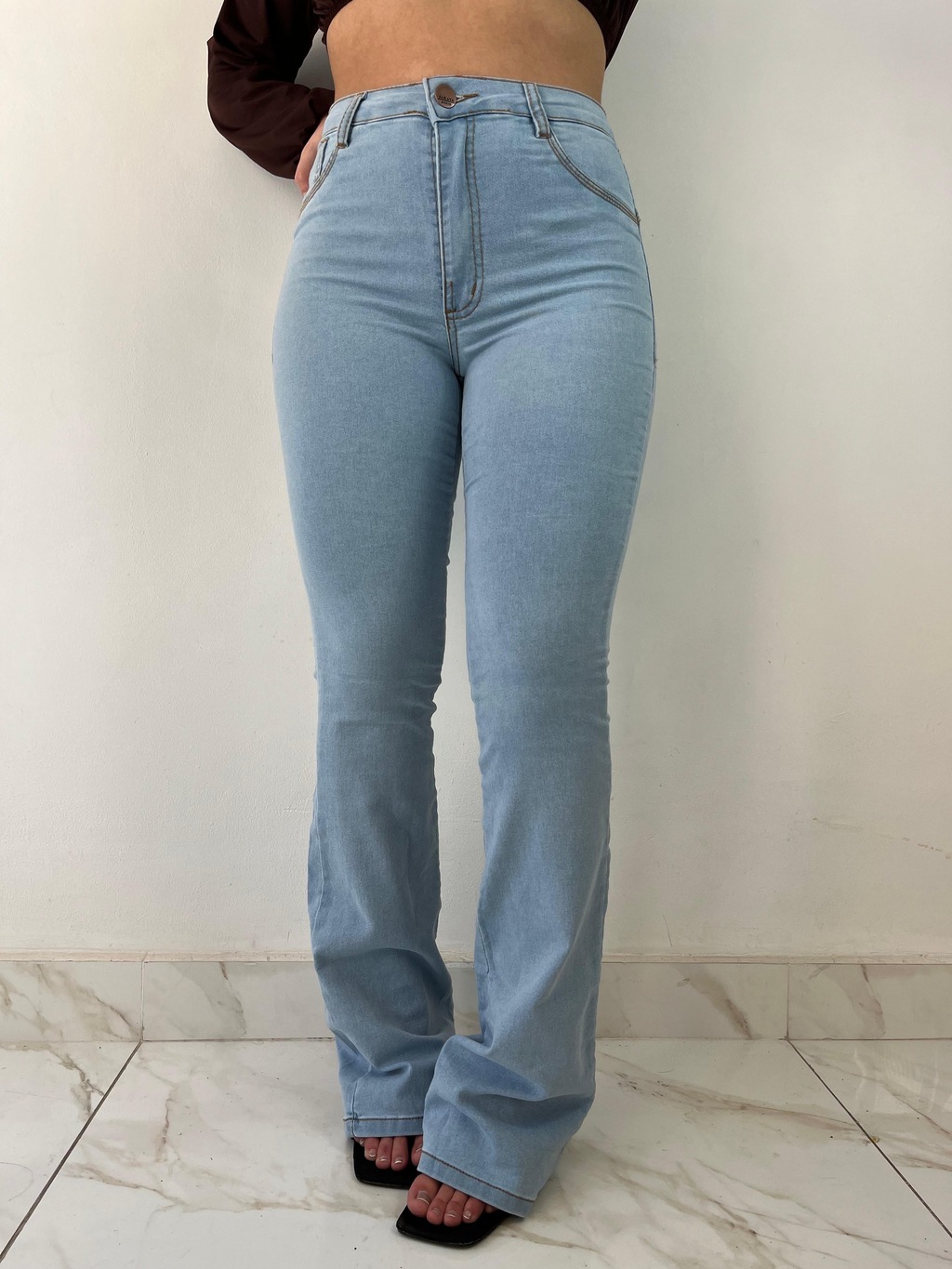 Modelagem cintura alta, jeans com elastano que garante conforto e ajuste perfeito ao corpo. O detalhe flare dá um toque elegante e super feminino ao look.