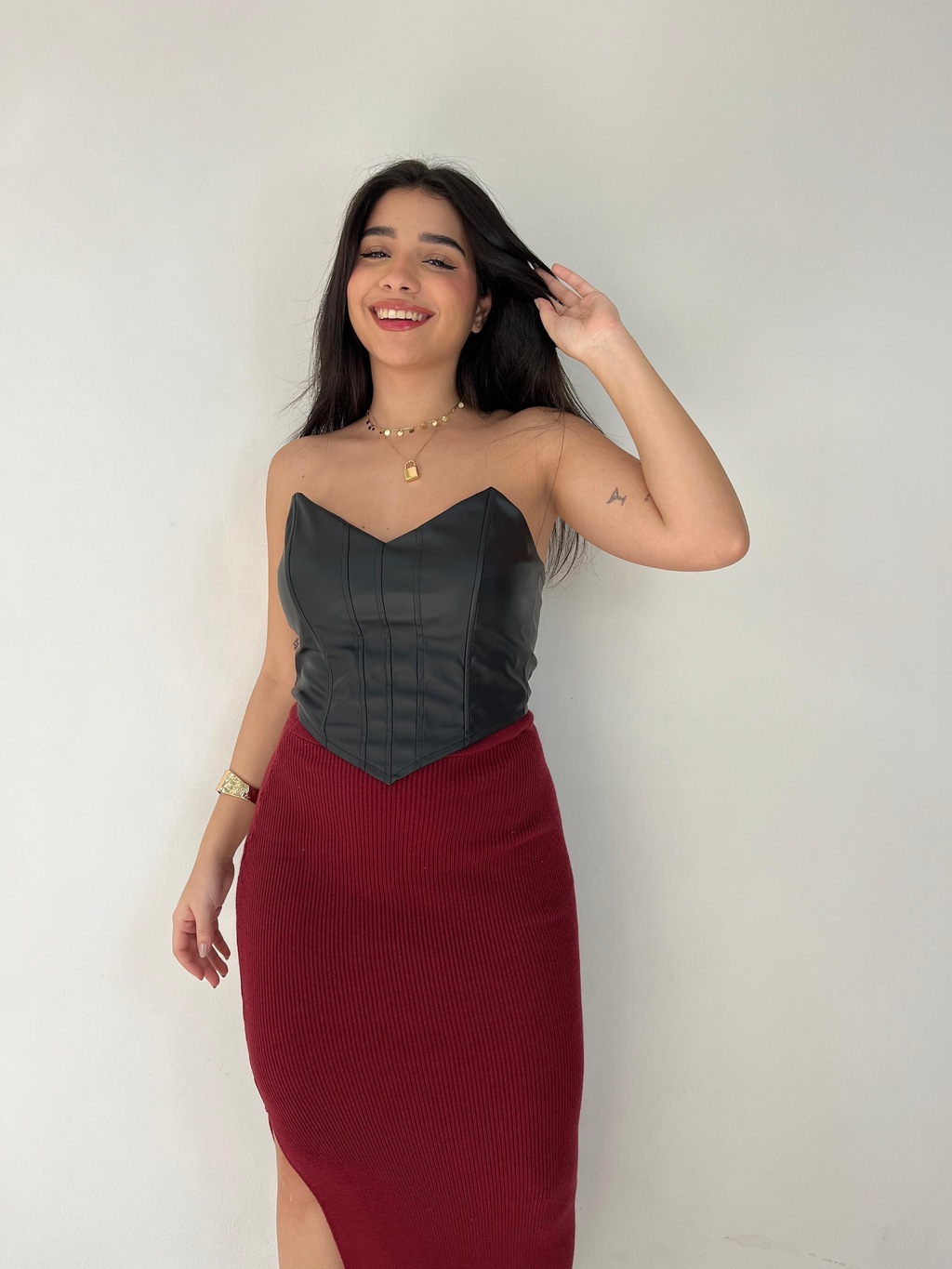 Corset em couro fake com modelagem estruturada que valoriza o busto. Fechamento nas costas com amarração e elástico para melhor ajuste ao corpo.